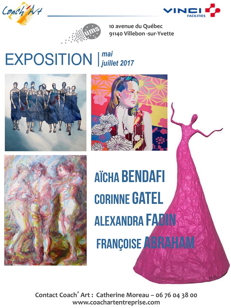 Exposition des "Danseuses Equilibre", sculptures multicolores (aluminium et acrylique) de la danseuse chorégraphe et artiste plasticienne Alexandra Fadin du 1er mai au 31 juillet 2017 dans les locaux de l'entreprise UMS aux côtés des peintures d'Aïcha Bendafi, Corinne Gatel et Françoise Abraham.
